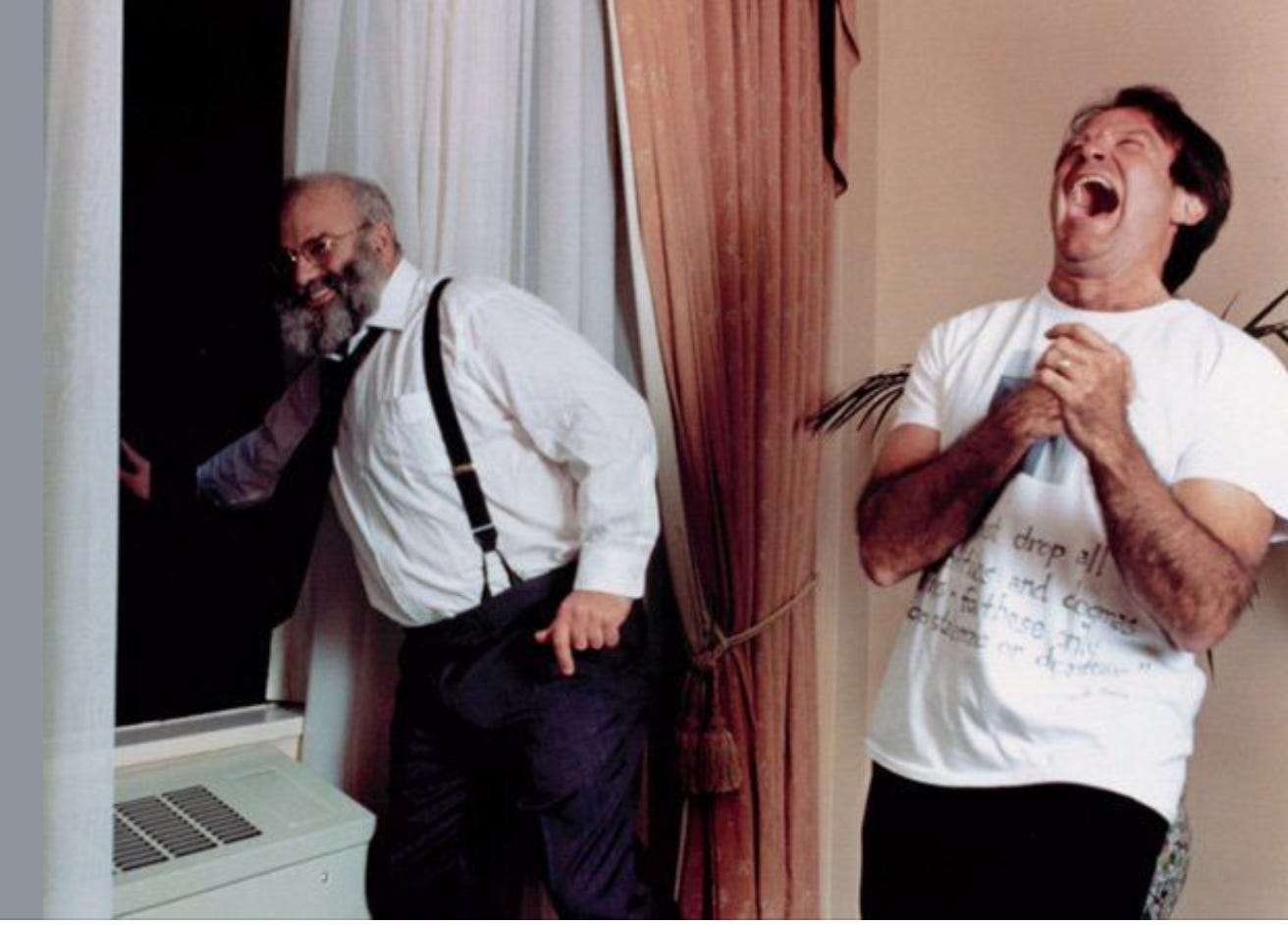 Oliver Sacks and Robin Williams who plays him, sharing a laugh on the set of Awakenings: